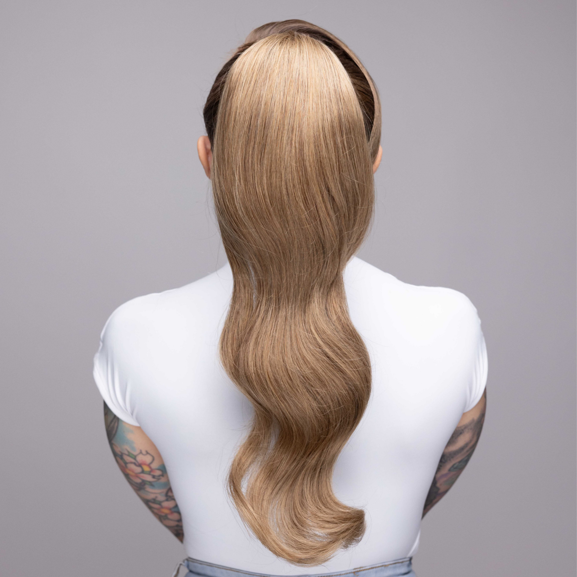 • Wickle die Klettverschluss-Strähne des Echthaar Ponytails eng um den eigenen Zopf.