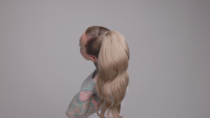 • Binde dein Eigenhaar zu einem festen Zopf – je nach gewünschtem Look hoch am Oberkopf, tief im Nacken oder mittig.
