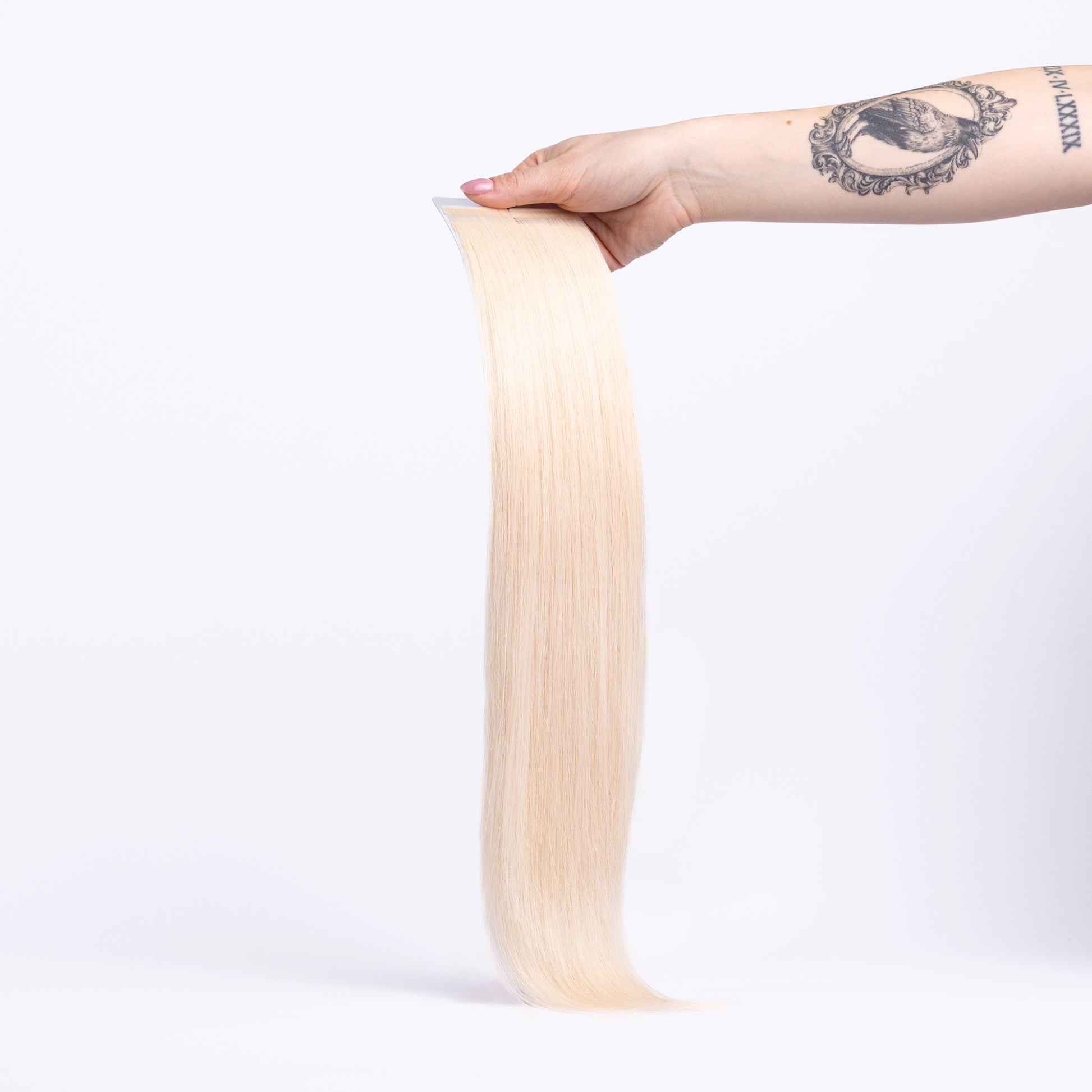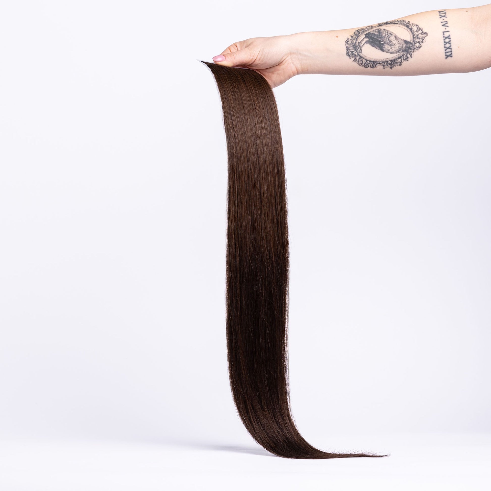 Für unsere Ultra Slim Extensions verwenden wir ausschließlich sorgfältig ausgewähltes Remy Echthaar in Premiumqualität. Die Haarstruktur ist glatt, bis in die Spitzen voll und lässt sich problemlos glätten, wellen oder stylen – wichtig ist dabei immer die Verwendung von Hitzeschutz.